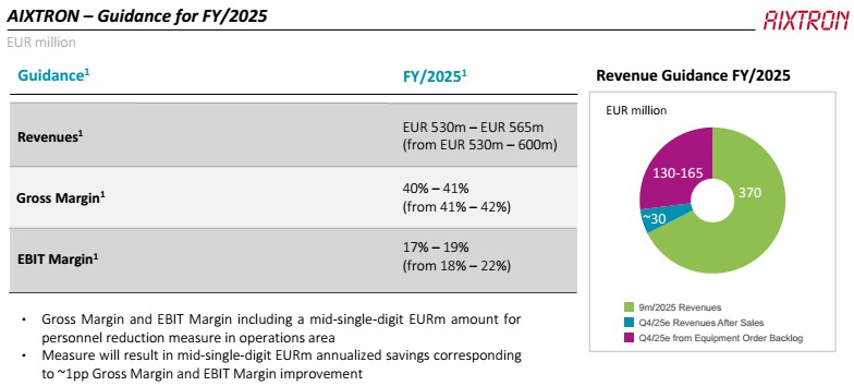 Based on the current soft market environment and assuming an adjusted exchange rate of US1.15/€ for the rest of 2025 (rather than US$1.10/€ previously) due to the currency headwinds, on 17 October Aixtron hence narrowed its full-year 2025 guidance for revenue to €530–565m (down 10.8–16.3% on 2024’s €633.2m), which corresponds to the lower half of its initial guidance of €530–600m. Of this, Q4/2025 revenue is expected to be up sequentially to €160–195m (comprising €130–165m from the equipment order backlog and €30m in after-sales revenue).