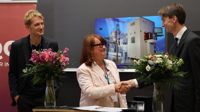 Photo: POEM Technology Center’s official launch. From the left: NQCP’s CEO Peter Krogstrup, Riber’s CEO Annie Geoffroy, and Joachim Mathiesen, head of the Niels Bohr Institute.