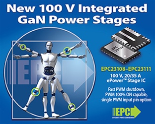 Efficient Power Conversion Corp (EPC) of El Segundo, CA, USA — which makes enhancement-mode gallium nitride on silicon (eGaN) power field-effect transistors (FETs) and integrated circuits for power management applications — has launched a new generation of 100V integrated GaN power-stage ICs (EPC23108, EPC23109, EPC23110 and EPC23111) targeting high-performance motion and power systems such as humanoid robots, drones, and other compact battery-powered platforms. The devices are designed to simplify implementation and improve operational robustness in real-world environments while preserving the efficiency and power density advantages typical of integrated GaN technology.