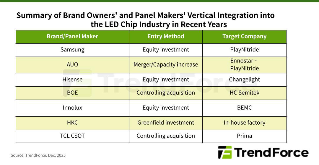 The acquisition underscores the increasing trend of brand owners and panel manufacturers venturing into the upstream LED chip market. Since 2018, companies like Samsung, AUO, Hisense, BOE, Innolux, and HKC have been progressively expanding their involvement in this sector.