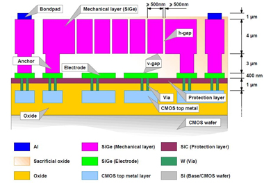Image: Cross section of device created with IMEC's baseline SiGe-MEMS platform.