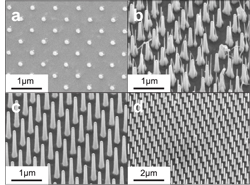 Figure 2: InP nanowire arrays created using soft nano-imprint lithography: (a) pattern of Au dots after lift-off process, prior to growth of nanowires; (b) nanowire array without suitable cleaning step with ‘grass-like’ wires appearing between intended structures; (c) and (d) nanowire array resulting from a piranha (sulfuric acid/hydrogen peroxide) cleaning step and 550°C anneal before growth.