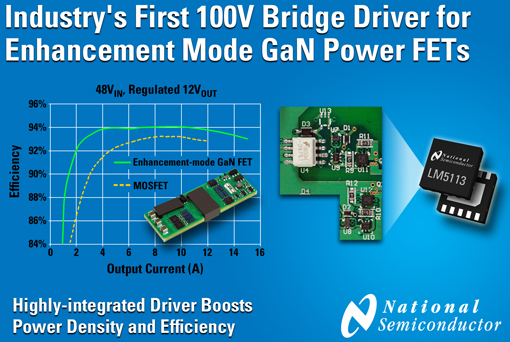 “National’s LM5113 bridge driver helps designers unleash the performance of eGaN FETs by simplifying the design,” says Alex Lidow, co-founder & CEO of Efficient Power Conversion Corp (EPC) of El Segundo, CA, USA, which makes E-mode GaN power FETs based on its proprietary gallium nitride on silicon (GaN-on-Si) technology for power management applications. “The LM5113 dramatically reduces component count, and paired with our eGaN FETs, enables a tremendous PCB area savings and higher level of power density versus equivalent MOSFET-based designs,” he adds.
