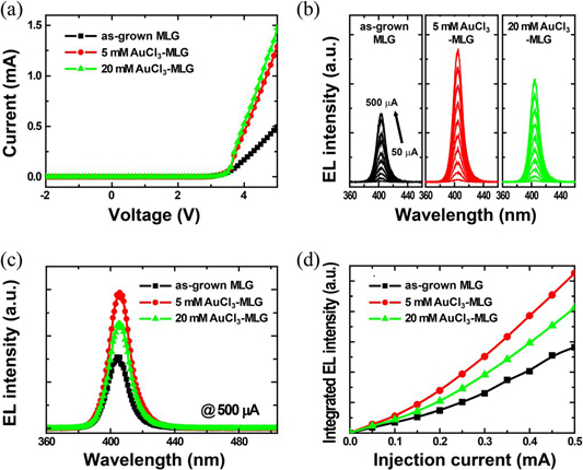 Figure 3: (a) Current-voltage (I-V) curves of GaN-based LEDs with as-grown MLG, 5mM AuCl3-MLG, and 20mM AuCl3-MLG. (b) EL intensity of the MLG-electrode GaN-based LEDs as function of injection current. (c) EL intensity of MLG-electrode GaN-based LEDs measured at 500μA. (d) Integrated EL intensity of MLG-electrode GaN-based LEDs as a function of injection current.