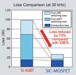 Also, due to the characteristics of silicon carbide, SiC power MOSFET body diodes typically feature a higher rise voltage (2.5V or more), possibly resulting in increased switching loss during inverter operation.