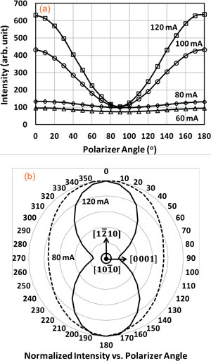 Figure 2: (a) Normalized light intensity versus polarizer angle at various currents above and below threshold. (b) Normalized light intensity versus polarizer angle well above and near threshold, plotted in radial coordinates.