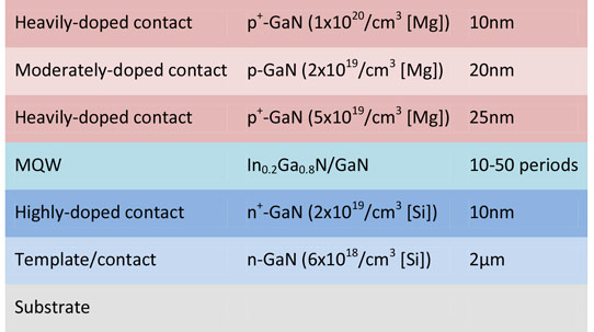The 30-period MQW on bulk GaN solar cell is still some way off from the theoretically ideal performance for an InGaN structure (Table 1). The main deficit in performance is related to the short-circuit current. The researchers say the limiting factor for the current density is the thickness of InGaN that can be grown before the onset of structural instabilities due to mismatch stresses. Such stresses degrade the absorbing material quality and hence solar cell performance.