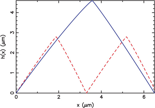 Figure 1: Optimal shapes for surface texturing of GaN LED when optimizing on (i) P, H, c, αleft and αright with ε = 2.763 (solid), and (ii) P, H, c, αleft and αright and ε (dashed). Parameters associated with these structures are given respectively in the third and sixth line of Table 1.