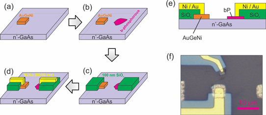 Figure 1: (a)-(d) Schematic representation of fabrication steps for thin-layer black phosphorous/GaAs p-n heterojunction devices. (e) Sketch of cross-section of completed device, and (f) optical micrograph of heterojunction device (top view).