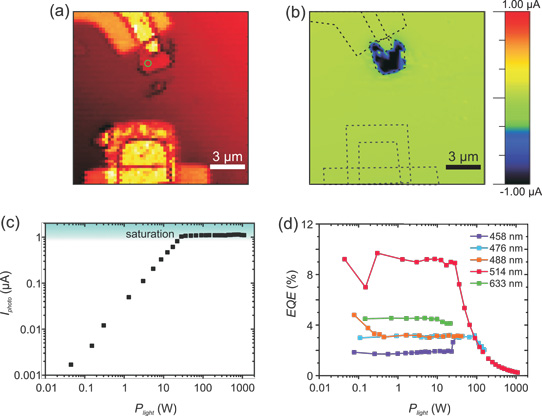 Figure 2: (a) Optical reflection image and (b) photocurrent map of device in Figure 1(f), recorded at zero source–drain bias. (c) Photocurrent as a function of laser power at 514nm wavelength. The signal was acquired from the green circle in panel (a). The blue-shaded region indicates current saturation. (d) EQE as a function of laser power for different laser light wavelengths.