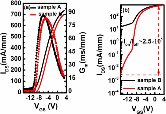 Figure 1: Transfer characteristics of AlGaN/GaN MISHEMTs on sample A and B templates.