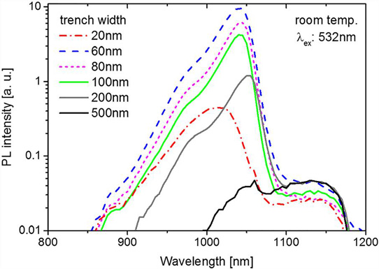 In photoluminescence (PL, Figure 2), a peak was seen between 1000nm and 1050nm, except for the very widest trench of 500nm. The photo-emission from the QWs was orders of magnitude higher than from the silicon substrate, which was centered around 1140nm. Some of the spectra show a shoulder around 980nm, which could be due to higher quantized states of the wells. The brightest peak was for 60nm-wide trenches. However, comparisons are complicated by factors such as ridge volume, carrier density, surface states, and so on.