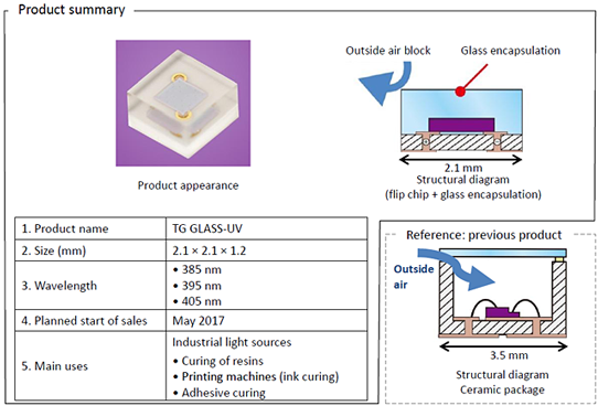 Toyoda Gosei Co Ltd of Kiyosu, Aichi Prefecture, Japan is to begin sales of its glass-encapsulated ultraviolet LED products developed in March 2016 for use as an industrial light source in the curing of resins, ink and adhesives.