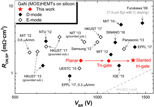 Figure 2: RON,SP versus VBR benchmark of slanted tri-gate MOSHEMTs against state-of-the-art GaN enhancement-mode and depletion-mode (MOS)HEMTs on silicon with breakdown criterion of 1\microA/mm. RON,SP based on 1.5\micron transfer length for each ohmic contact. VBR for all reference devices re-calculated based on 1\microA/mm criterion.