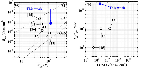 Hard breakdown (VBR) under reverse bias occurred at 1200V. The researchers suggest that the breakdown mechanism could be impact ionization. The power device figure of merit (FOM) VBR2/Ron was 2.1x108V2/Ω-cm2, using the specific on-resistance (Ron) of 7mΩ-cm2 from the linear region of the current-voltage curve. The team plotted benchmark comparisons of Ron, VBR, Ion/Ioff, and FOM (Figure 2).