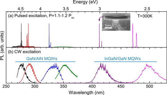 The laser threshold was an order of magnitude smaller for the InGaN/GaN devices, compared with GaN/AlN microdisks (Table 2). “This can be interpreted as the difference between resonant and non-resonant excitation,” the researchers write. “Indeed, the laser energy is below the AlN bandgap and above the GaN bandgap. The 266nm laser pumps the excited states of the GaN/AlN QW, and the 10 QWs can only absorb part of it. On the contrary, the entire pulse energy is absorbed by the GaN barrier in the case of InGaN QWs, leading to a larger carrier density per QW if we assume that all carriers are transferred from the barrier to the well.”