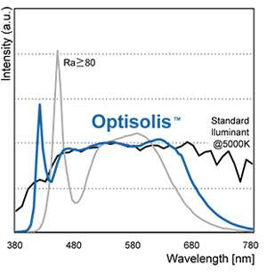 Using Nichia’s own blue chip and phosphor technology and optimized for the general lighting market, Optisolis has an ultra-high color rendering index (CRI) with a spectrum that is claimed to demonstrate the closest match to that of the standard illuminant (so all colors are reproduced to the color seen under a standard light).