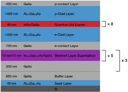 The researchers used n-type substrates for the solid-source MBE (Figure 1). The chamber was first heated to 950°C for 5 minutes of substrate annealing. Threading dislocations were inhibited from reaching the QD layers by growing a series of three 300nm GaAs layers followed by InGaAs/GaAs strained superlattices. The threading dislocation density in the QD region was estimated at 5x107/cm2. The team points to thermal cyclic annealing during deposition as a possible route to even lower density.
