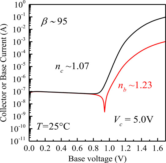 With 5V collector-emitter voltage, the DC gain of one device was 95. The ideality factors for the collector and base currents were 1.07 and 1.23, respectively. The base sheet resistance came in at 430Ω/square. The breakdown for collector-emitter, collector-base and emitter-base stresses were 9.35V, 13.2V and 9.69V, respectively.