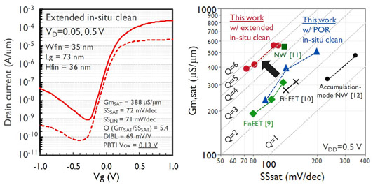 Graphic: Improved performance and reliability of Ge nFinFET device. (Left) Best ID-VG curves obtained from 35nm-wide Ge nFinFET with dummy gate oxide and extended in-situ clean. (Right) Extrinsic GmSAT versus SSSAT benchmark of n-channel Ge fin and nanowire FETs at VDD=0.5V.