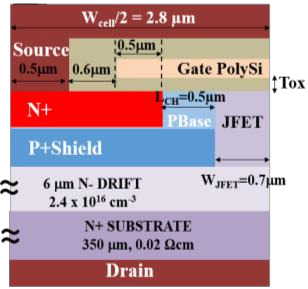 In the on-state, with 15V on the gate, the simulated peak oxide field was 5.6MV/cm (3.6MV/cm for 55nm). The researchers believe this large on-field is acceptable, “because an oxide electric field of 6MV/cm at 175°C will result in stable on-state operation for 1000 years.”