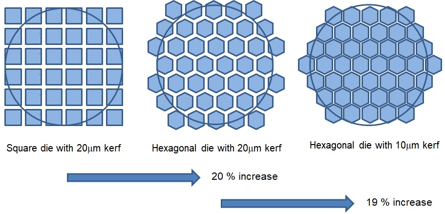 Additional DPW increase can be obtained by chip shaping. Unlike conventional die singulation methods that can only separate die in a linear direction (i.e. only able to separate either square or rectangular die), chemical dicing enables free-shape die (e.g. hexagonal) formation and singulation. Hexagonal die can increase DPW by more than 20% due to enhanced tiling efficiency and increased usable wafer area (Figure 1).