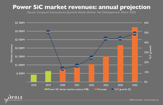 The beginning of 2020 shows that this year will be the year of GaN, reckons Yole. But, in parallel, silicon carbide (SiC) is continuing its emergence. Driven mainly by electric vehicles and hybrid electric vehicles (EVs/HEVs), EV charging infrastructure and industrial power supply applications, Yole expects SiC power discrete and modules to play a key role in the coming years. Power SiC market revenue is expected to grow at more than 13% year-to-year to exceed $3bn by 2025.