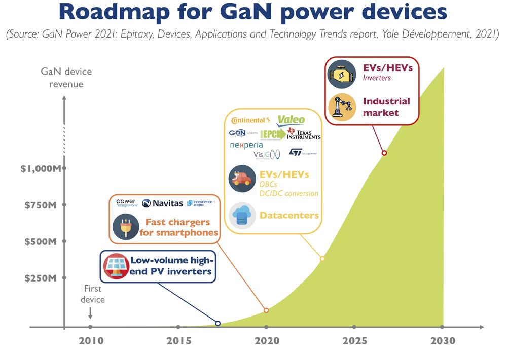 In the long term, in cases where GaN has proven its reliability and high-current capabilities at a lower price, it can penetrate the more challenging EV/HEV (hybrid electric vehicle) inverter market and the conservative industrial market, which could create remarkable high-volume opportunities for GaN, says the report.