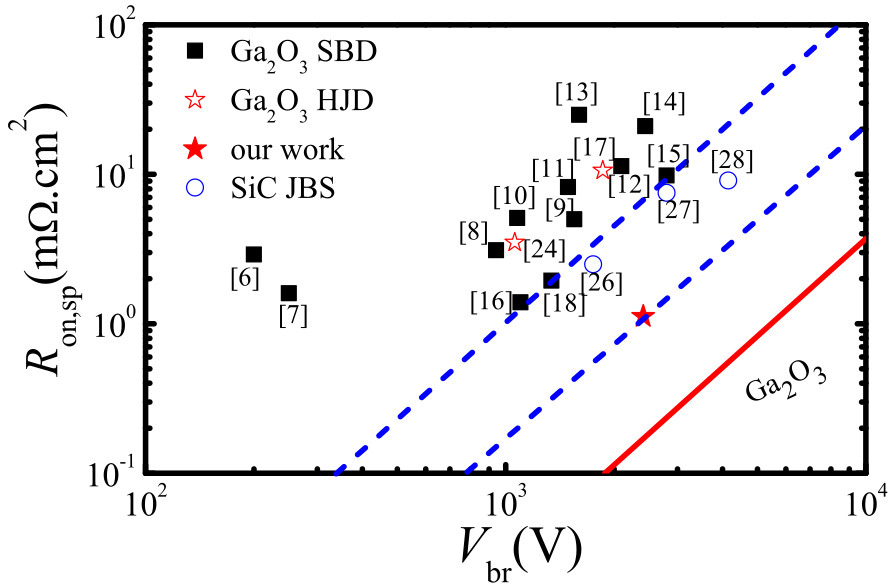 Figure 2: Plot of Ron,sp versus Vbr for reported vertical β-Ga2O3 and SiC diodes. Red solid star represents Hebei/Nanjing record. Diagonal lines represent equal Baliga FOMs, including Ga2O3 theoretical limit.