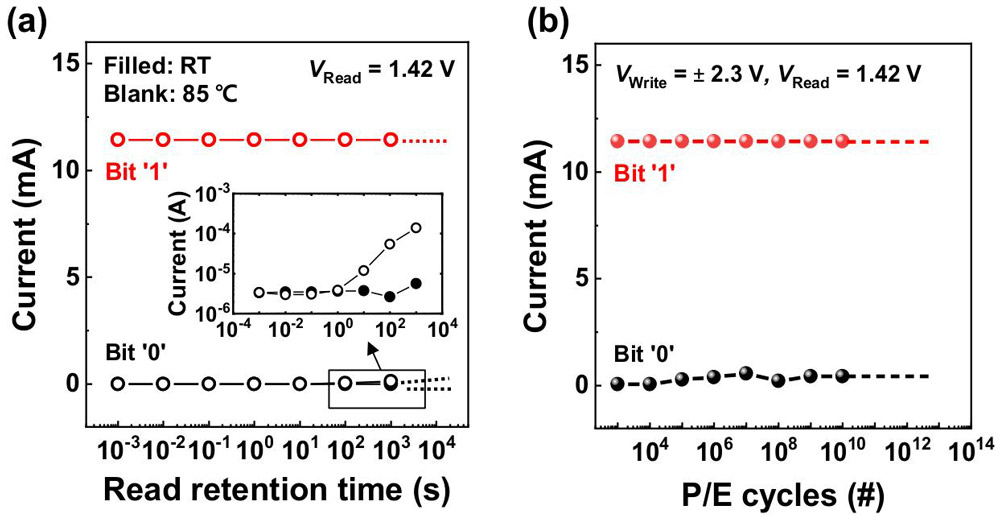 The data retention reached more than 1000s for measurements at room temperature and 85°C (Figure 2). The endurance of the device reached to at least 1010 P/E cycles, the point at which the test was stopped. The endurance performance was attributed to the low operation voltage along with the gateless structure.