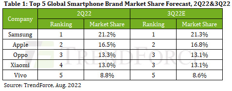 For Apple, Q2 is a transition period as it hands off old models for new and is nominally the quarter with the lowest production performance during the year. Initial operational performance was affected in Q2 by the implementation of lockdowns in Shanghai and Kunshan which hobbled supply chain supply. The output shortfall created during the lockdown period was made up with production capacity adjustment after the lockdowns were lifted. Apple still produced 48.2 million units in Q2, ranking second in the world. Looking to Q3, the iPhone 14 Pro and Pro Max are among four new models to be upgraded to the A16 (TSMC 4nm) processor. Upgrades such as initial starting memory capacity increasing to LPDDR5 6GB and 256GB, primary camera moving up to 48 million, Face ID Design changes etc., are expected to raise starting prices. However, under pressure from rising global inflation and foreign exchange rates, Apple is expected to adopt a more cautious pricing strategy so as not to affect its sales performance.