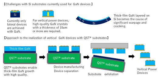 Since QST substrate is designed to have the same coefficient of thermal expansion (CTE) as GaN, it enables suppression of warpage and cracking of the GaN epitaxial layer and can hence enable large-diameter, high-quality thick GaN epitaxial growth. It is hence expected to be applied to power devices and RF devices (5G and beyond 5G), which have been growing rapidly in recent years, as well as to micro-LED growth for micro-LED displays.