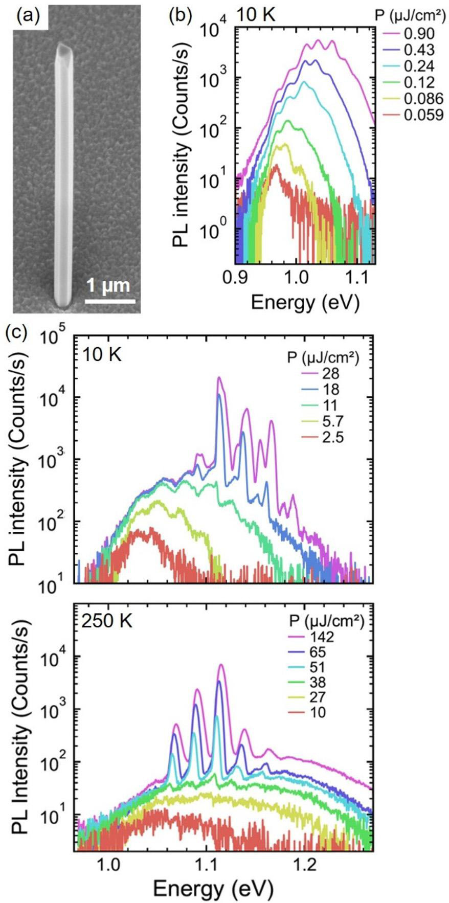 A single NW lying on sapphire was subjected to optical pumping at 10K and 250K (Figure 2). Lasing occurred at higher pump power with distinct peaks at energies between ~1.06 and 1.15eV. Below threshold, the spectrum peaked around 1.28μm wavelength. At 10K, the transition from amplified spontaneous emission to lasing began around 11μJ/cm2. The 250K peaks were shifted about 50meV in energy, reflecting thermal bandgap narrowing. The lasing thresholds for 10K and 250K were 12.1μJ/cm2 and 45.2μJ/cm2, respectively. One NW had a 10K laser threshold as low as 3.2μJ/cm2.