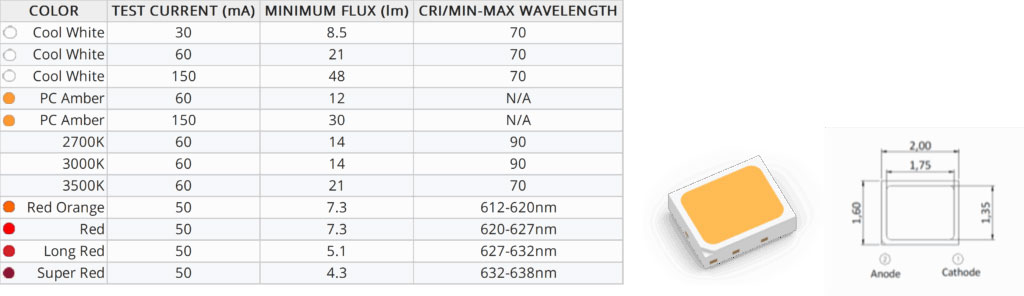 LUXEON Versat 2016 is an AEC-Q qualified LED portfolio offered in a broad color and performance range. At just 2.0mm x 1.6mm and with a z-height of just 0.52mm, design options are maximized. In addition to the standard direct and phosphor-converted colors, LED-emission spectral tuning is available to match transmission of foils as used in car-body and grille illumination for superior color control.