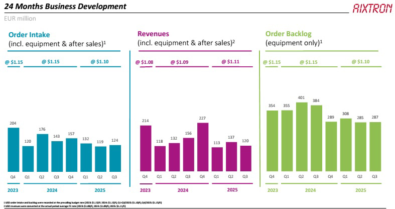 For third-quarter 2025, deposition equipment maker Aixtron SE of Herzogenrath, near Aachen, Germany has reported revenue of €119.6m. This is down 13% on €137.4m last quarter and down 23.5% on €156.3m a year ago, and in the lower half of its guidance range of €110–140m, reflecting the continued soft market environment.